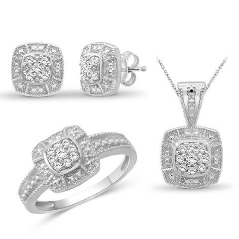 3-Piece 1/3 Carat White Diamond Sterling Silver Earrings Set, Sterling Silver Necklace, Sterling Silver Rings – Square Shaped Jewelry