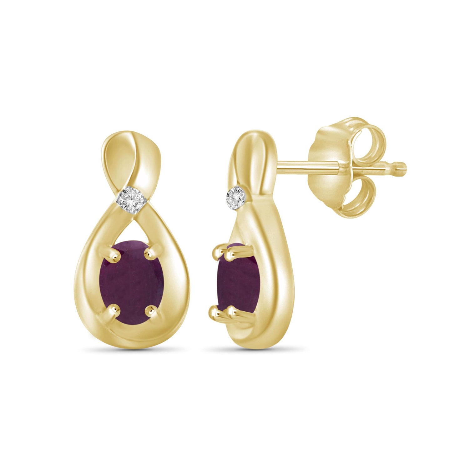 These not-so-basic, sparkling Ruby and Accent White Diamonds earrings are finely nestled in prong settings in shining 14K Gold Plated Silver, which contrasts beautifully against the dark gemstones. Chic and simple yet dramatic and bold, these Ruby and Accent White Diamonds earrings add a touch of sparkle to your everyday looks and an edge to dressy outfits. Whether it's their fiery simplicity, timeless look or glamorous luster, our exquisite Ruby and Accent White Diamonds s are sure to make an artistic statement! Easy to clean & maintain: Your Ruby and Accent White Diamonds s will stay shiny and looking new for years to come with simple, fast cleaning Everlasting shine: Precisely cut to boost shine, sparkle and dazzle in a four prong, floating setting Versatile: For work, play & everything in between - instantly class-up your look with these earrings 14K Gold Plated Silver construction: Superior polish and shine that lasts for years to come. Rust, tarnish and scratch-resistant - ideal for daily wear. These 14K Gold Plated Silver earrings can last a lifetime and can be passed down through generations. Finally, an earring in which you can sleep, shower, and play Hypoallergenic, nickel-free and lead-free to prevent any skin reactions and allergies. Our exclusive rounded back protects your neck from painful pokes when you talk on the phone or sleep. The Push back design is secure, so you won't have to worry about losing your gemstone earrings while you go swimming. Lightweight enough for long time wear; you might even forget that you're wearing these beauties until the compliments come pouring down...
