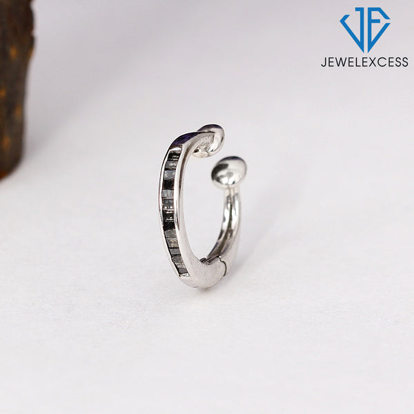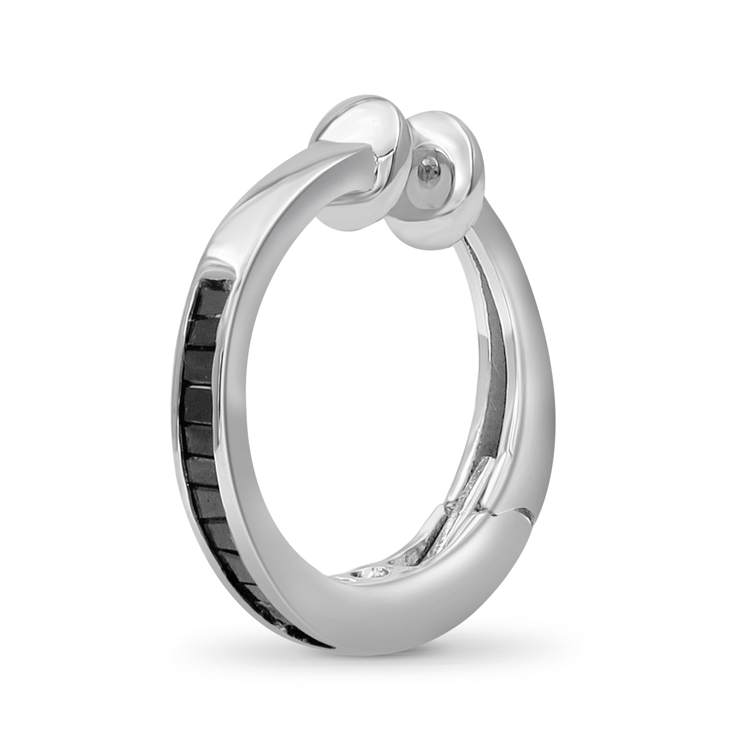 At JewelExcess, we forge our Black Diamond Cuff Earrings set out of sturdy, durable .925 Sterling Silver, set off with a row of glimmering, authentic 1/10 Carat Black Diamonds. Made to last, these sparklers have a secret: a hinged hoop closure that makes taking them on and off smooth & easy. So you can look forward to comfortable wear, every day.