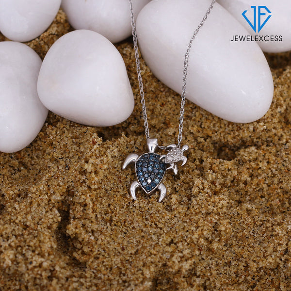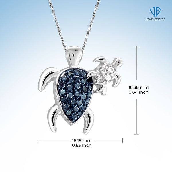 - The perfect gift – A symbol of wisdom, patience, and good luck, our charming sterling silver pendant ’s mother sea turtle glows with Blue Diamonds as deep and richly blue as the ocean, while her little one sparkles with pure, bright White Diamonds. Measuring 16.38mm x 16.19mm, this gorgeous silver diamond necklace makes an ideal Christmas gift or birthday gift for mom, grandma, or granddaughter.