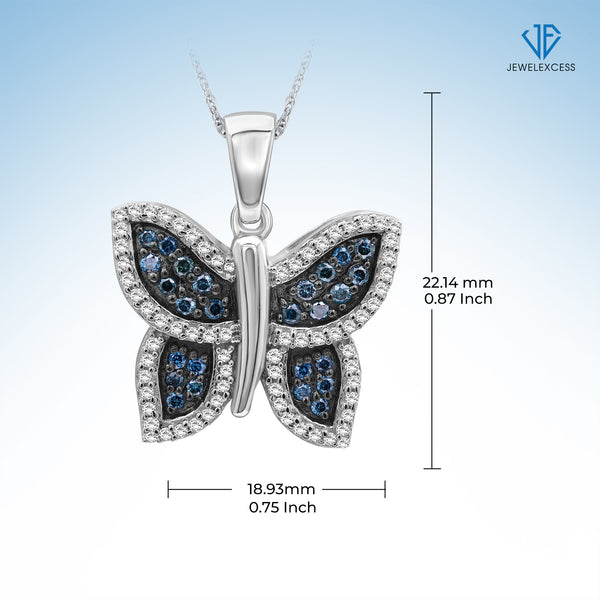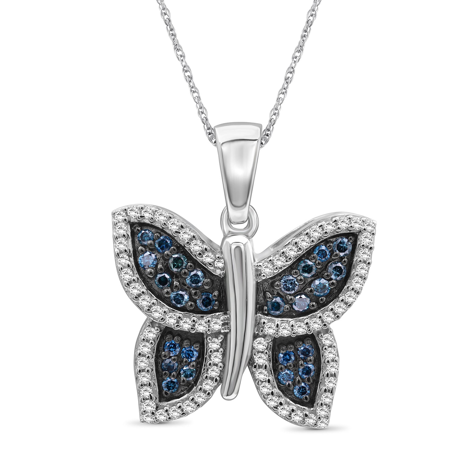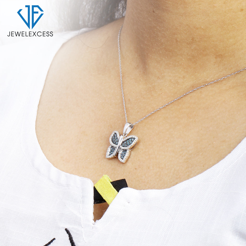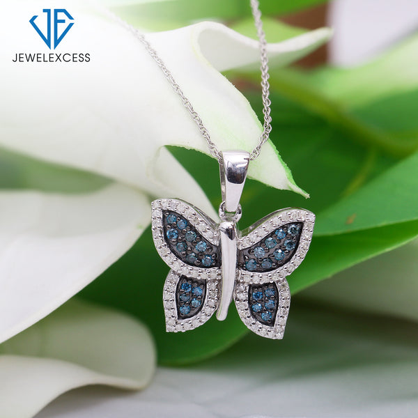 - You want the perfect Sterling Silver butterfly necklace to add sparkle to your outfit – beautiful quality with exceptional style. The JewelExcess Sterling Silver Butterfly Pendant necklace is made with authentic 1/2 CTW Blue & White Diamonds and set in strong, durable .925 Sterling Silver, for a genuine diamond pendant that shines and glimmers in the light.