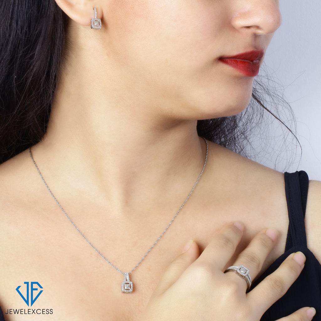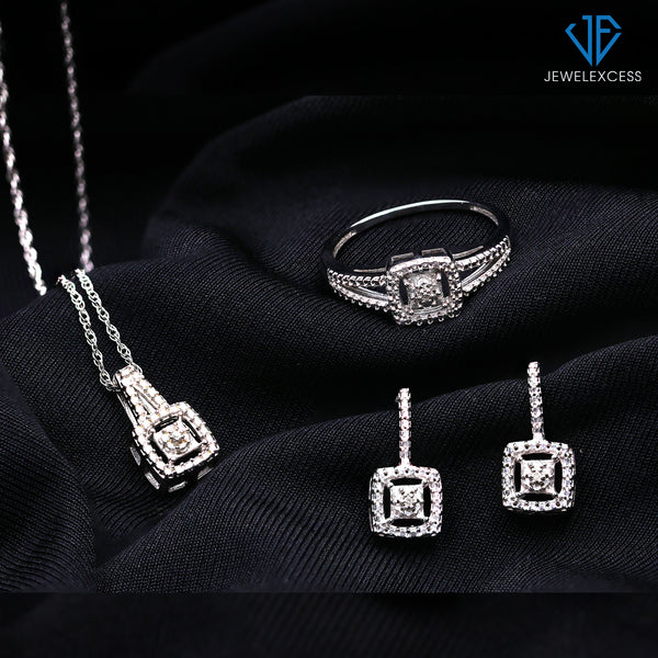- The JewelExcess 3-Piece White Diamond Square Jewelry Set is crafted with highly durable .925 Sterling Silver and genuine White Diamond accents, for an elegant diamond earrings, pendant & ring set that will last as long as your love for each other.