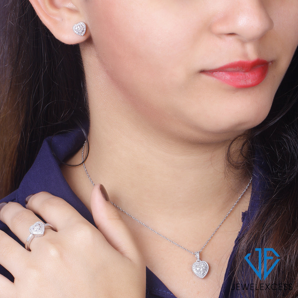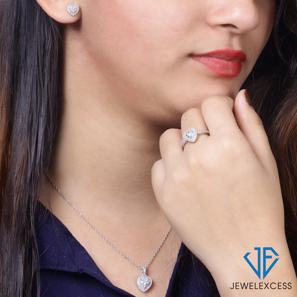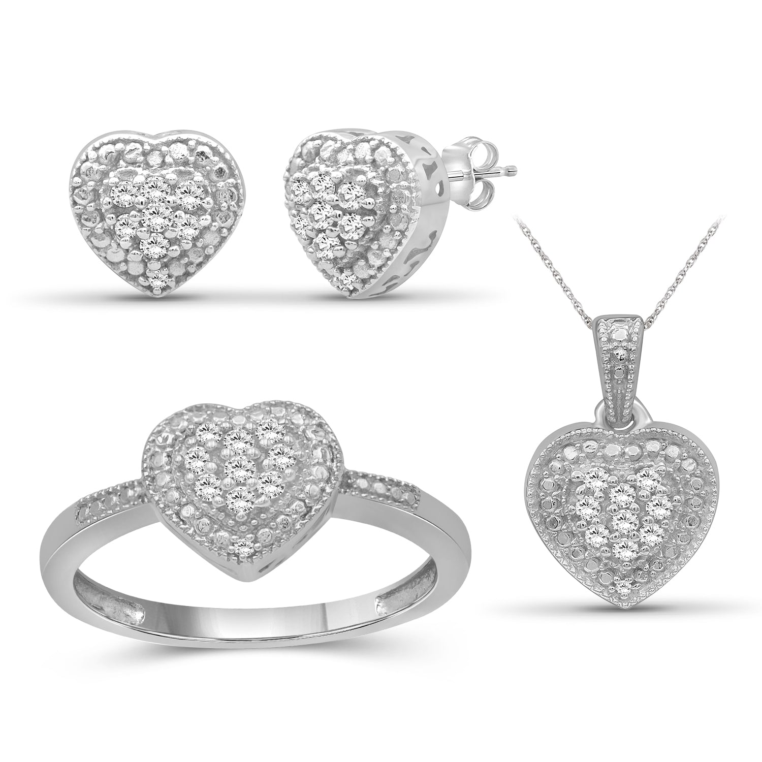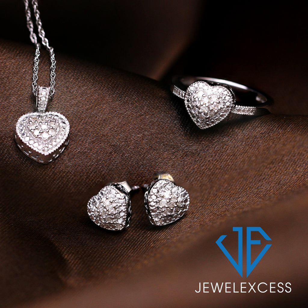 - The JewelExcess 3-Piece White Diamond Heart Jewelry Set is crafted with highly durable .925 Sterling Silver and genuine 1/3 Carat White Diamond, for an elegant diamond earrings, pendant & ring set that will last as long as your love for each other.