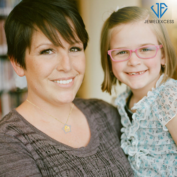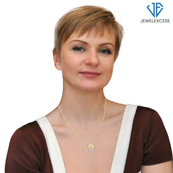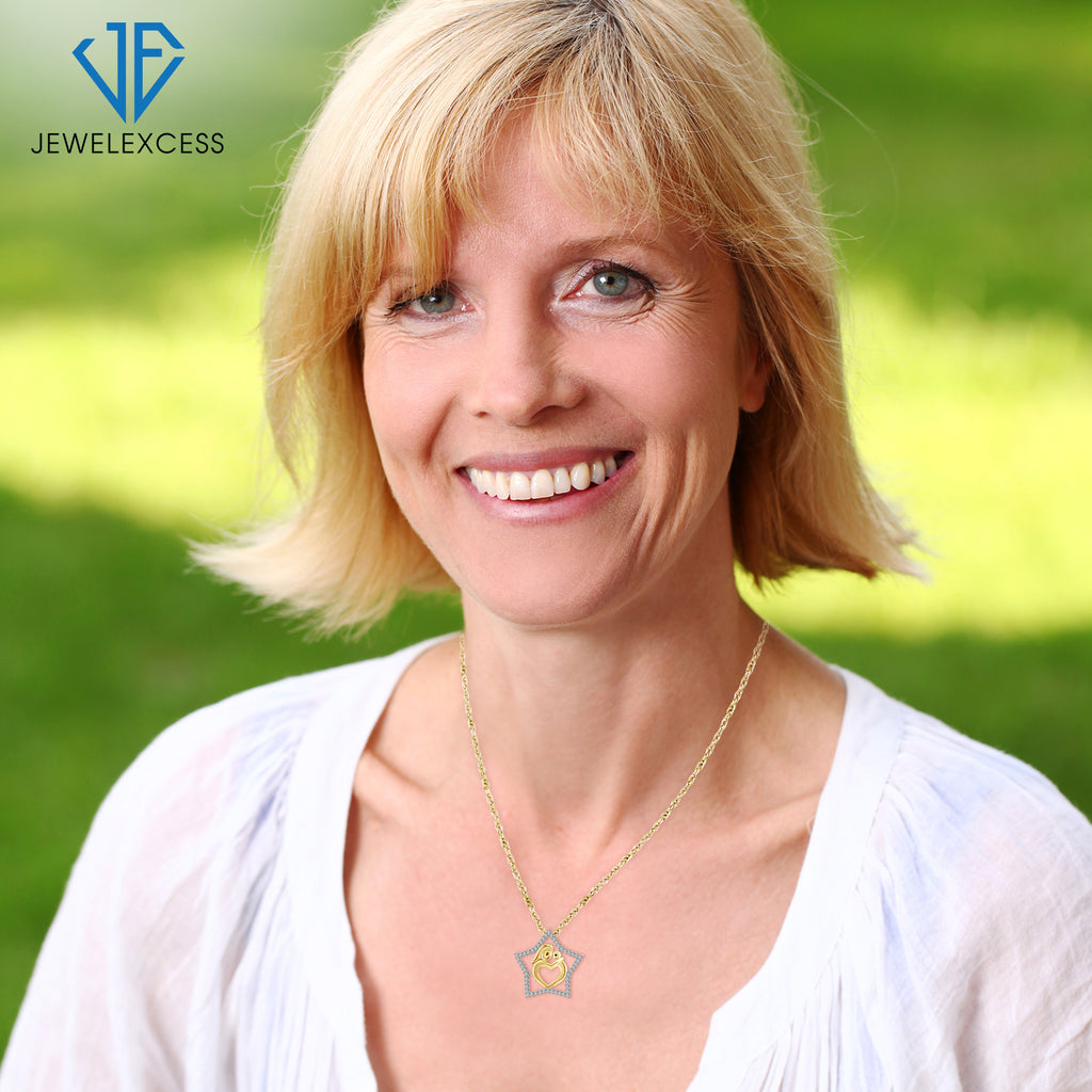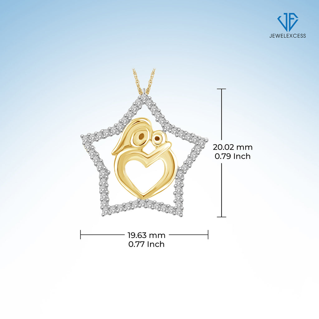 - This exquisite pendant necklace features a beautiful mother and child in shining, plated gold over silver set in a white diamond adorned star, honoring the bond between mother and child. Our stunning star necklace pendant measures 0.77” across by 0.79” on a sturdy golden chain that stands up to even curious little hands. These elegant, lightweight diamond necklaces for women will truly be a treasured and meaningful gift.