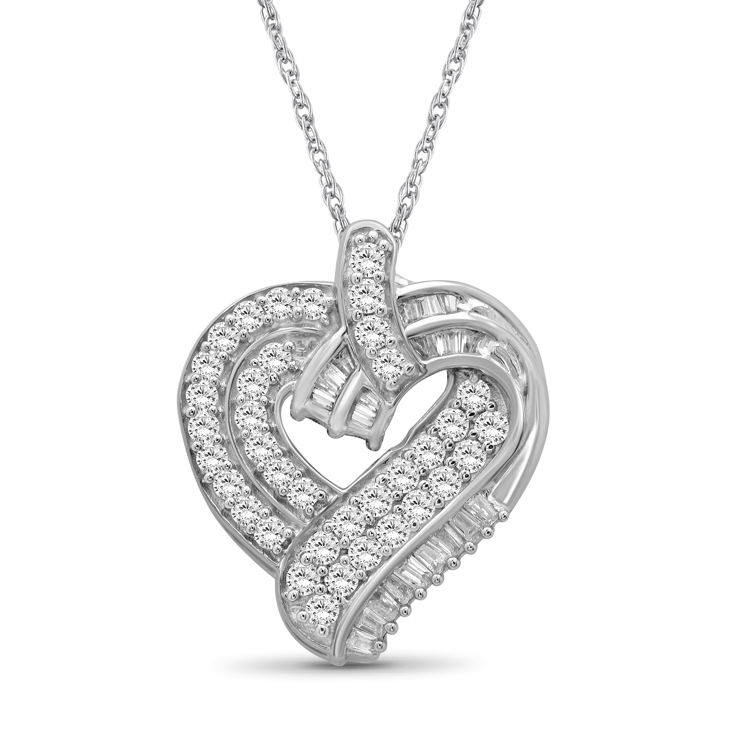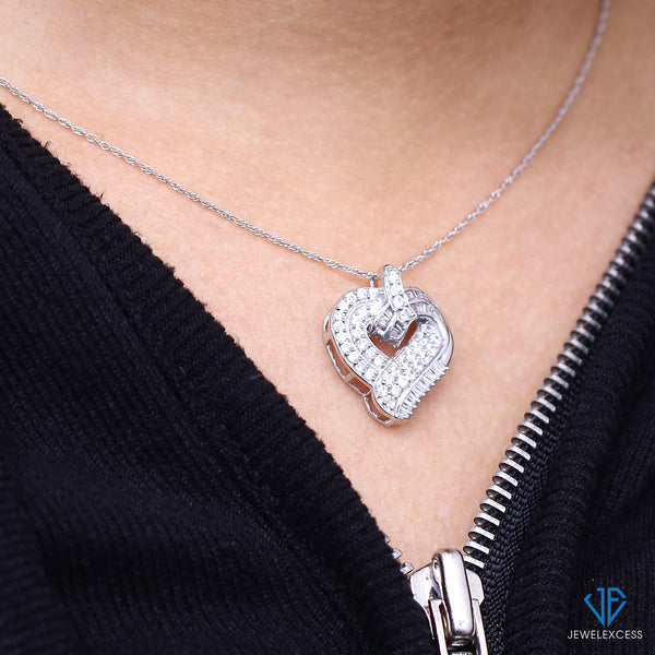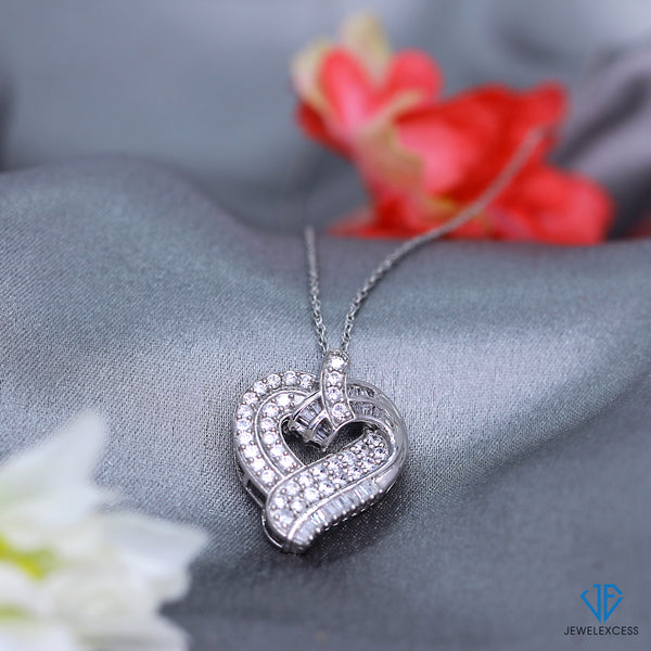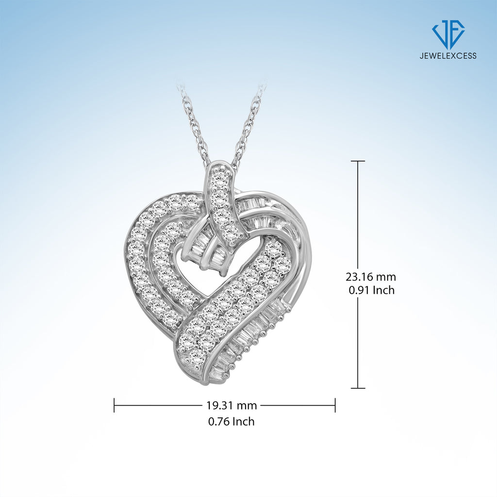 Sterling Silver (.925) Heart Necklace with 1.00 Carat White Diamonds | Jewelry for Women with Round & Baguette White Diamonds & 18 inch Rope Chain with Spring Clasp