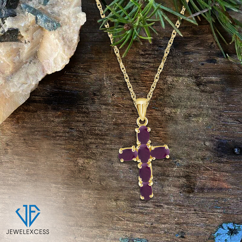 1.56 Carat Ruby Gemstone Cross 14K Gold-Plated Pendant