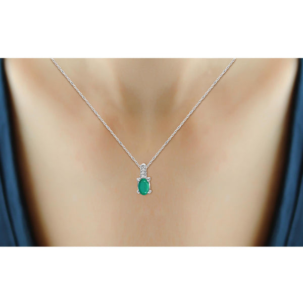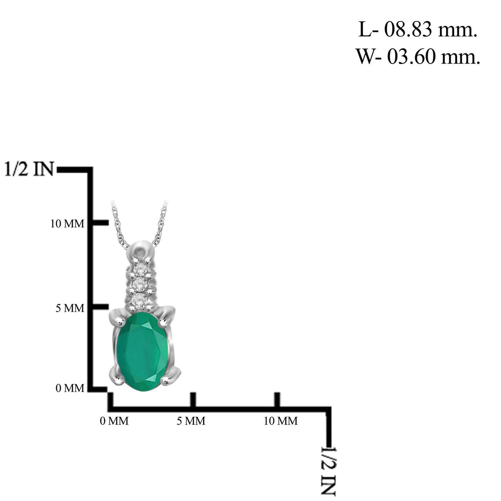 Dress yourself up in sparkling style with this gorgeous pendant. Plated with rhodium for that highly polished sheen, it is accented with white diamonds that shimmer at every angle. In addition, an oval-shaped genuine emerald gemstone captures the lion's share of the attention for a glamorous look that you won't be able to resist. This pendant also comes with an 18-inch rope chain that provides a comfortable, secure fit that you will be sure to love.