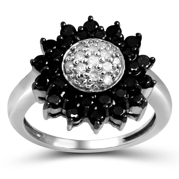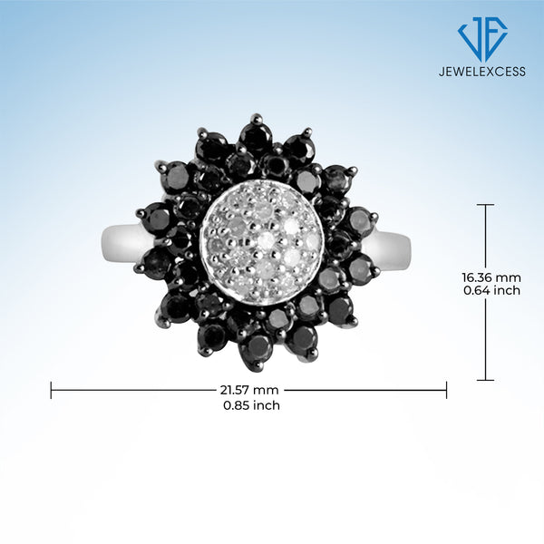 1.00 Carat T.W. Round cut Black & White Diamond SunFlower Sterling Silver Ring
