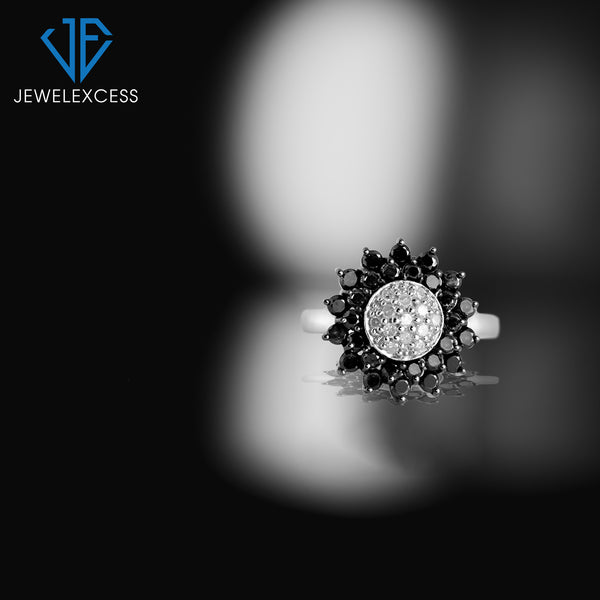 The undeniably stunning contrast of black against white makes for a mesmerizing visual treat. Twirled around your finger, this ring will make a fascinating addition to your attire. It’s dramatic in design and features white genuine diamonds in the center surrounded by black genuine diamonds in a sunburst design. It'll sparkle and shine as it glimmers under any light. Perfect for the chic, modern woman, it exudes luxury and elegance, adding sophisticated allure to everything from your most casual T-shirt and jeans ensemble to your most jaw-dropping cocktail dress.