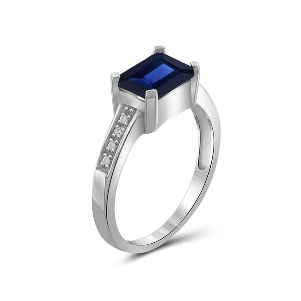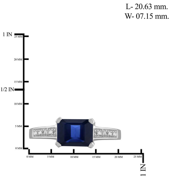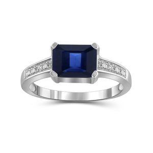 A vision of color, this gemstone ring features an eight-millimeter by six-millimeter emerald-cut sapphire gemstone accented by pave-set round brilliant diamonds in a design of 925 sterling silver with a high polish.