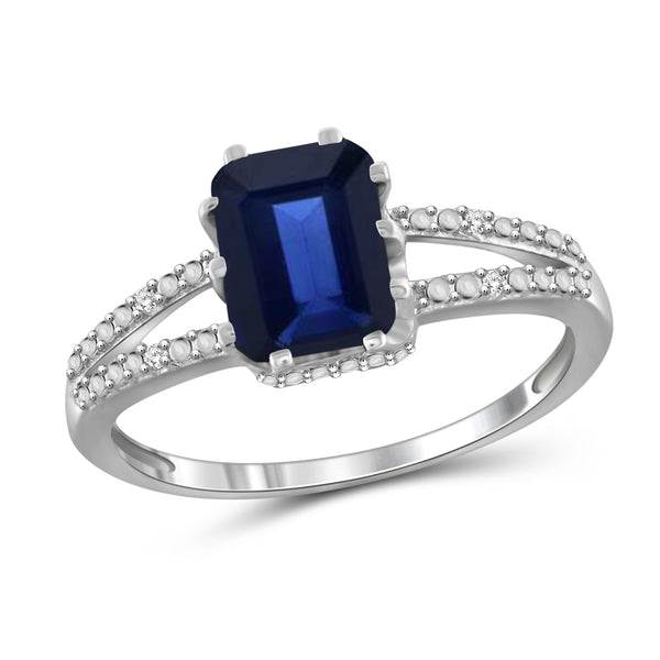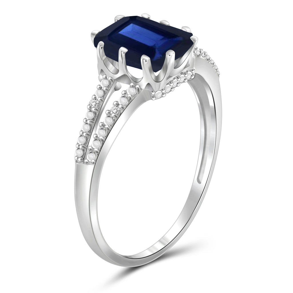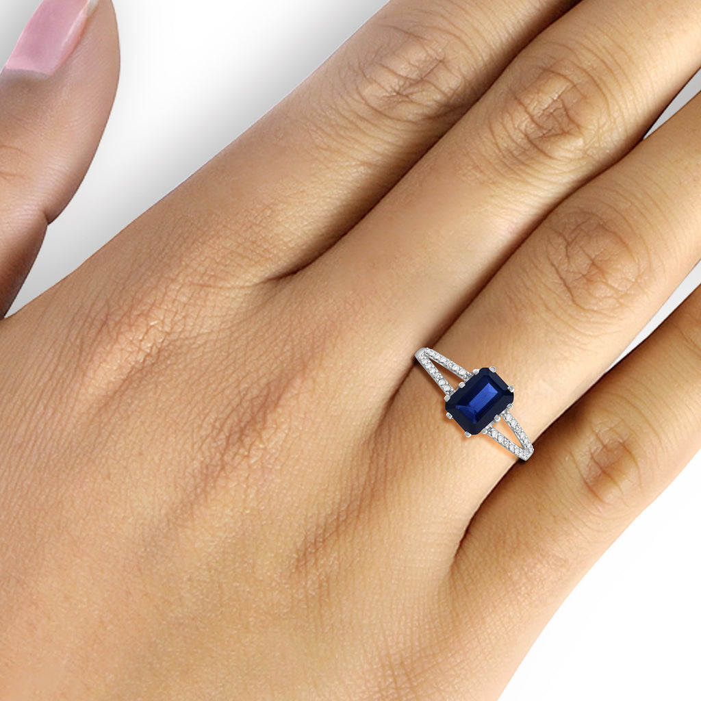 A classic but stylish choice, this elegant eight-millimeter by six-millimeter emerald-cut sapphire gemstone ring showcases a split shank adorned with accent round diamonds framed in 925 sterling silver with a high-polish finish.